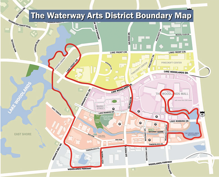 The Woodlands Township Board of Directors approved on December 5, 2018 the logo, branding and boundary map for The Waterway Arts District embracing the cultural arts development in The Woodlands.